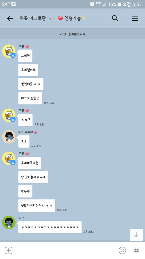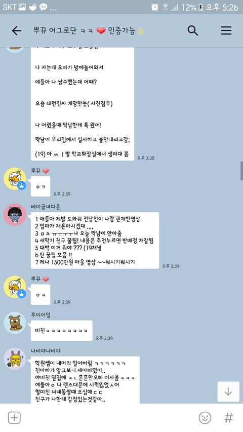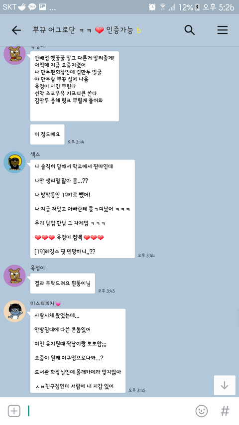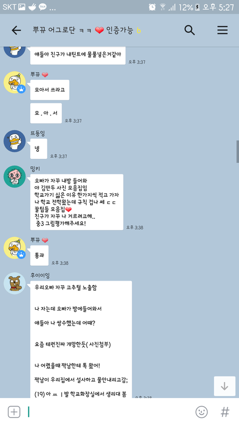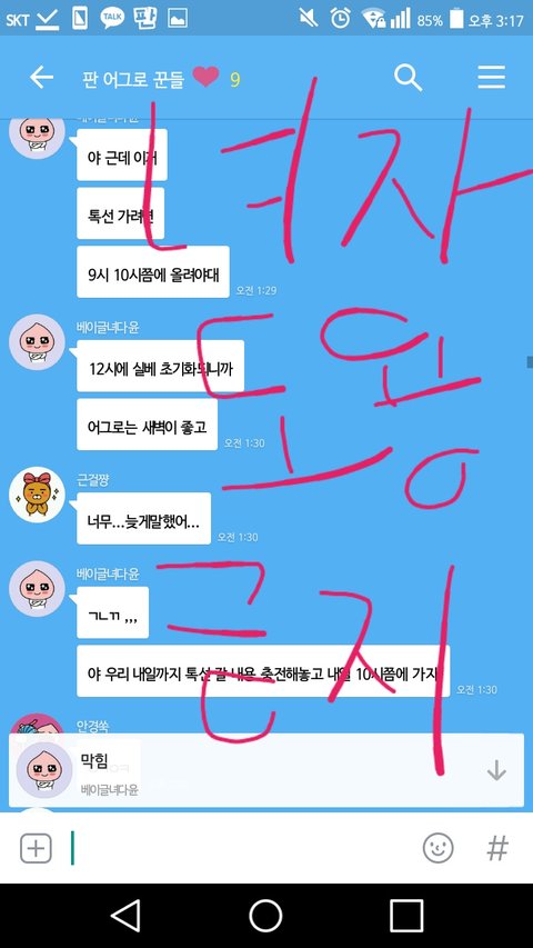 // 이 톡방에 어떻게 들어갔냐면 어제 오후에 ㅃㄲ 걔네 팸중 하나가 ㅇㄱㄹ들 모집한다 해서 스파이로 들어갔고 들어가서 걔네 상황 지켜보다 말안하고 지켜보는 애들 내보내길래 나도 ㅇㄱㄹ인척 했어ㅇㅇ 시간은 어제 오후 3시 30분쯤?아마 그전부터 걔네는 모여서 톡방에서 ㅇㄱㄹ끌 생각 했겠지ㅇㅇ그리고 중간에 ㅃㄲ 걔가 옵챗 정지 당해서 ㅎㄷㅇ가 오디션 대신 봐준다 했어.