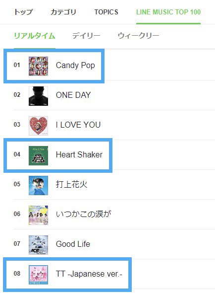 하트쉐이커 - 한국 활동 곡이고 일본에선 발매도 안한 노래. 심지어 일본어 버전도 없고 가사도 다 한국어인데도 일본 음원 싸이트에서 4위 (이건 진짜 미친 거임. 팬들도 엄청 놀랐음)