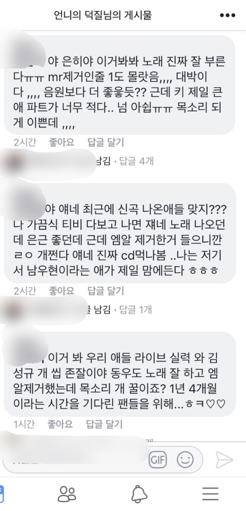 애들 잘한다는 말 졸라 많음 칭찬 개많아 노래 좋다는 말도 많고ㅠㅠㅠㅠㅠ잉부심 뿜뿜이다ㅠㅠㅠ