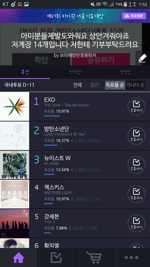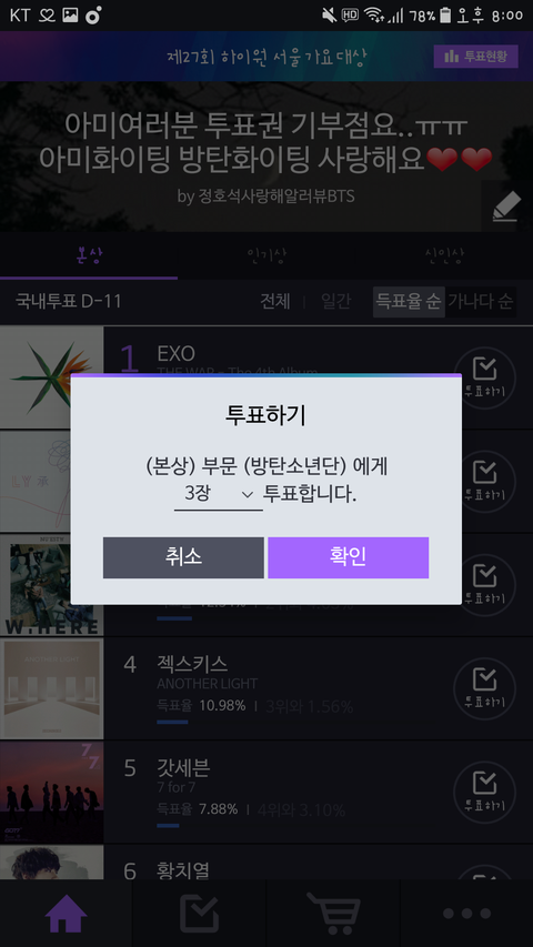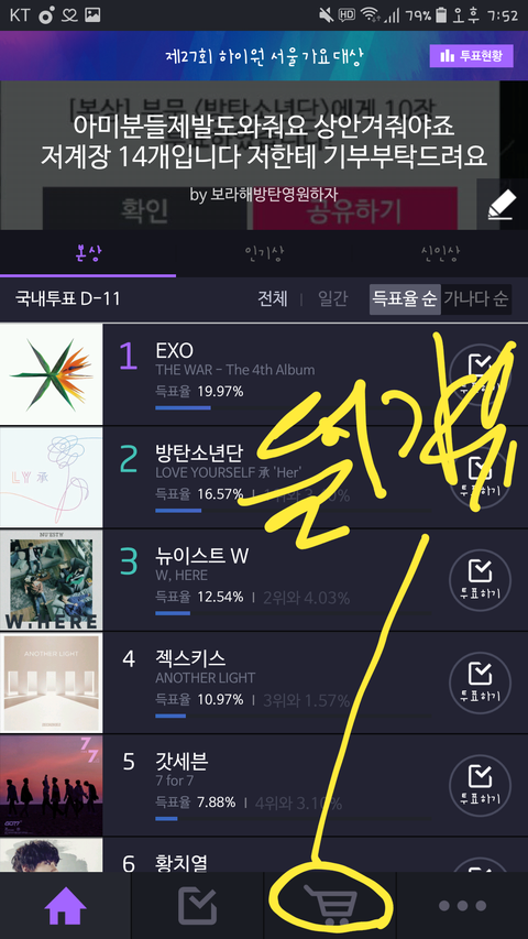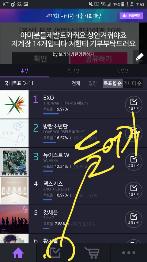 마지막으로 투표하는 방법은 들어오면 첫번째 화면으로 뜨는 메인에 투표하기 누르고