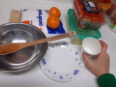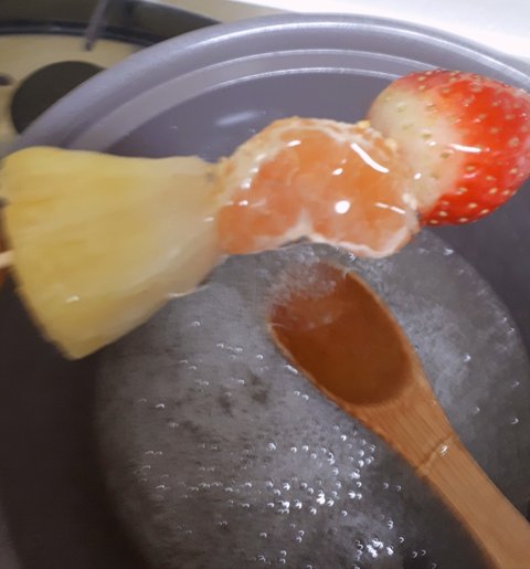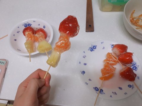 <준비물>과일, 물, 물엿, 설탕, 꼬지(꼬치?)