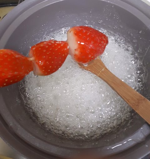 딸기에 발라용~ 이거 생각보다 두껍게 발린다? 너무 야매로 했나봐ㅠㅠ 나 사실 블로그에서 레시피 몇 개 읽어보고 훅해서 만든 거거든...ㅋㅋㅋㅋㅠ