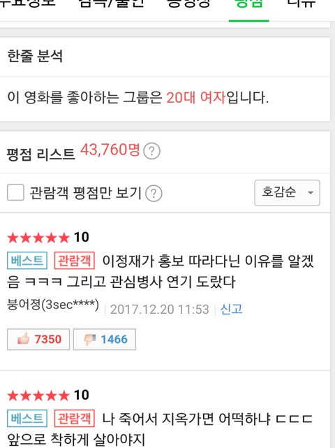 밑에 사진은 신과함께 평점에 등록된 베스트평점댓글 인데 저 베플이 첫번째고 공감수가제일많더라
