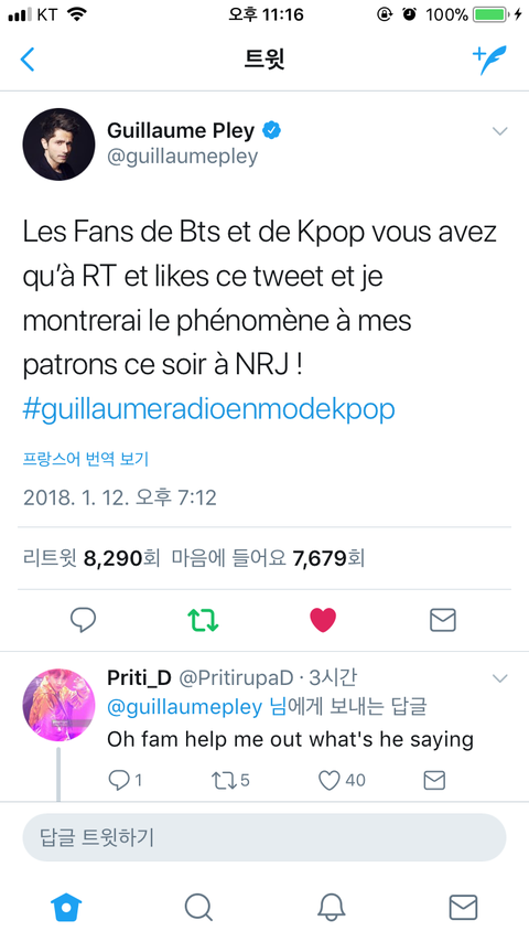 아미들이 알티하고 마음많이 누르면 프랑스방송국사장에게 보고하겠다고했데ㅜㅜ
