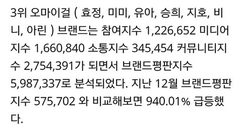 오마이걸 원래 순위가 좀 많이 낮았었는데 갑자기 3위로 급부상 광고 러브콜 엄청나게 들어오고 있다는데 사실인가봄 정말 브랜드 평판지수가 940% 증가함 ㅋㅋㅋㅋ 진짜 이건 기적같음 오마이걸 소속사는 물 들어올 때 노를 확실히 좀 저었으면 좋겠다