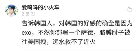 한국사람한테알려라 한국에대한 좋은 감정은 확실히 전부 엑소이다.그렇지 않으면 사드를 배치하고 팔과 팔꿈치를 미국쪽으로 돌리겠다.