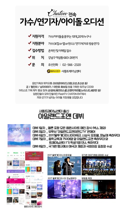 샤똥엔터테인먼트에서 데뷔와 동시에 멜론, 엠넷, 지니, 소리바다 등 음원사이트 메인을 장식한 [아일랜드 조앤], 그 뒤를 이을 재능있는 가수/연기자/아이돌 지망생들을 2018년 1월 전속 오디션으로 모집중입니다! 많은 관심과 참여 부탁드립니다. 문의 전화: 02-556-2320