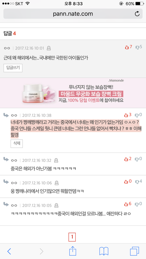 중궈 무시 댓글 더 모아야 되지 않아?