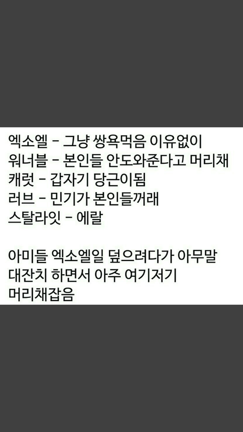 논점 흐리기 가지가지넼ㅋㅋ저것도 첨 들어보는 소린데 우리팬덤싸잡으면서 우리가 여기저기 머리채잡앗댄다 이렇게하면 저쪽은 끝도 없는거 모르나