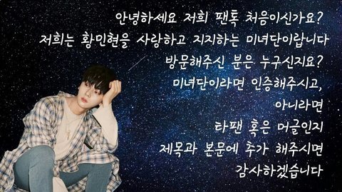 황민현 팬톡은 현재 엔터 출입을 자제하고 있습니다. 해당 글은 황민현 팬톡에서 작성된 글이 아니며, 황민현 팬톡의 공식 입장이 아님을 알려드립니다.