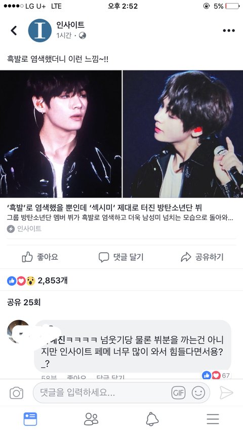 다른 기사도 아닌 방탄소년단 멤버 중 하나인 뷔 기사글에만 쿵쾅 대는중 ㅋㅋㅋㅋㅋㅋㅋㅋㅋㅋ난 뭐 화나서 기사마다 댓글테러 하는구나 했는데 걍 저 뷔 기사글에만 저렇게 댓글달아논거였음 ㅠ 으으으으 니네 팬덤끼리의 일 아님?ㅋㅋ