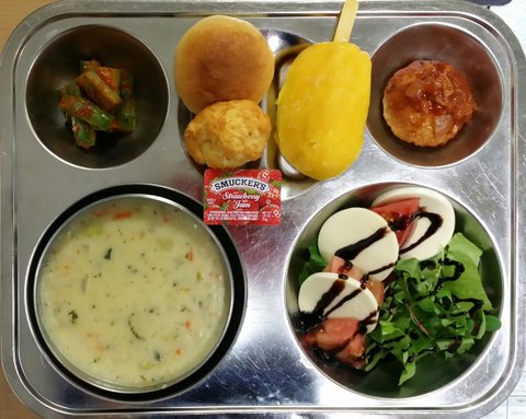 카프리제 샐러드와 치즈함박스테이크. 비스켓과 모닝빵, 후식으론 아이스망고까지. 서양음식의 날이었어요 안어울리는 오이김치는 선생님들을 위한 반찬^^; 밥도따로 제공되었거든요