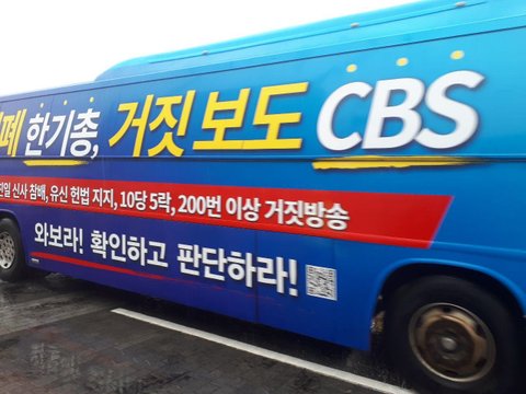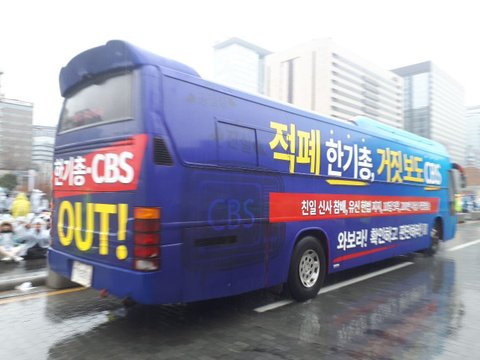 버스에 쓰인 강한 멘트가 한기총과 CBS를 향한