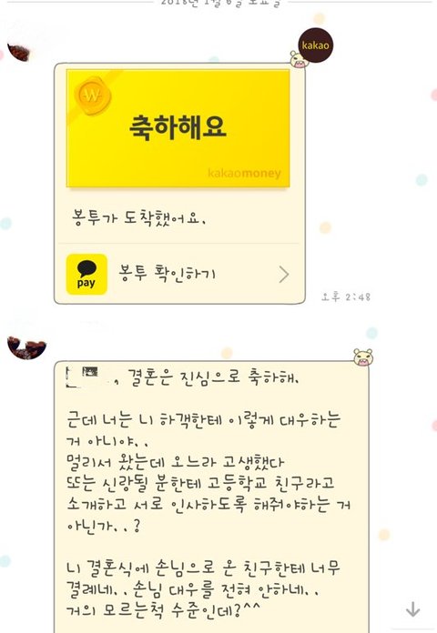 나중에 확인해보니 카××뱅크로 돈을 보냄 보통 보내면 말하지 않음? 말도 안함 친구 후에 확인해보니 송금취소 상태 더군다나 친구 식이 오후2시였는데 송금시간이 2시48분!!!!!! 진짜 여기서부터 어처구니가 없고 화가남