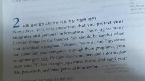 아까 한번 도와달라고 올린 쓰니야 나 진짜 영알못이고 기본적인 단어도 모르는 애인데 몇십분동안 2번 지문 해석했어...