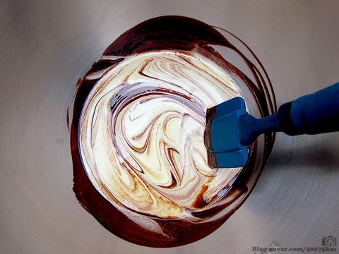 초콜렛과 버터가 다 녹으면 잘 저어서 섞은 다음, 달걀 크림을 두세번에 걸쳐서 나누어 넣고 섞어줍니다.