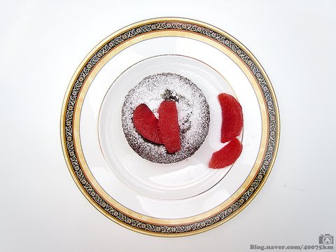 너무 시간을 오래 지체하면 안쪽의 녹은 초콜렛이 케이크에 다 흡수되어 버리므로 재빨리 슈가파우더를 뿌리고 과일 절임을 얹어서 따뜻할 때 먹으면 됩니다.