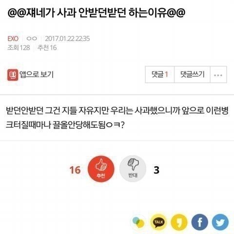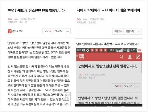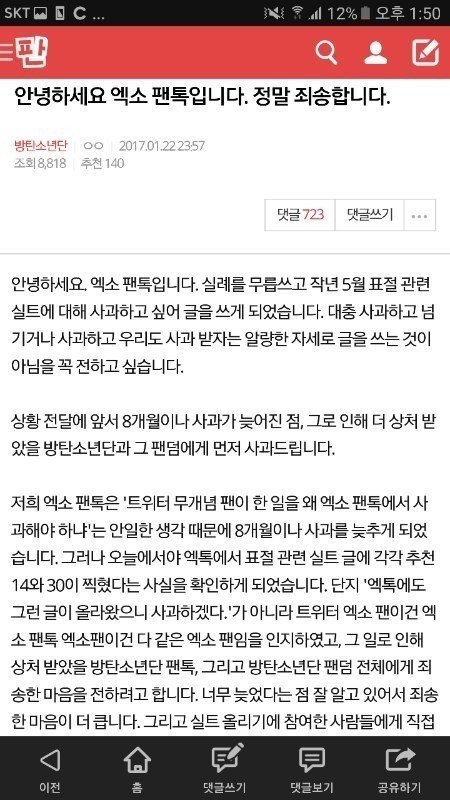 1. 엑셀들이 방탄팬톡에 사과를 함