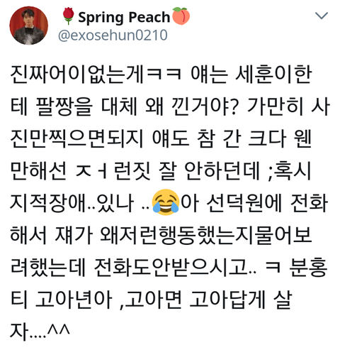 엑소 세훈이 고아원? 어쨌든 그런 델 가서 사진을 찍는데 어떤 애가 세훈 팔짱끼고 찍엇나봄 그런데 누가 그거 일반인 얼굴 1도 안 가리고 사진 올리면서 고아니 뭐니 심한 욕함 ,,, 팬코 아니래 밑에 누가 얘 계정이랑 인스타까지 다 털어서 엑소엘인거 증명함 어떻게 불쌍하게 봐줄래도 며칠을 못가냐 너네는 ㅠ