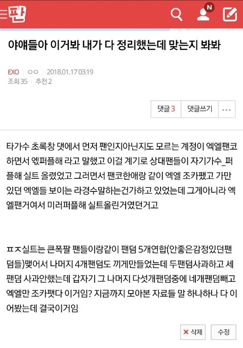 +)추가로 말하면 저 초록창 댓단거 내가 알기론 엑 퍼플해하고 하트 조카붙힌거로 병크난거아니냐? 그리고 그거 합성이라고 떴고 내 기억엔 그럼