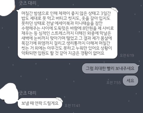 문자로 내 주소랑 그런거 다보내고 그랬는데 하루동안 답장이 없는거임 그래서 카톡을 보냈더니 2일뒤에 이렇게 카톡이 오는거임