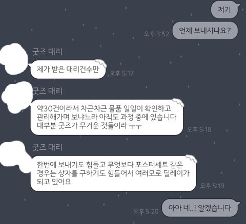 내가 윙파콘 하기 전에 트위터에사 굿즈 대리 찾아서 대리를 맡겼음 번호 교환까지 해서 카톡으로 연락했음