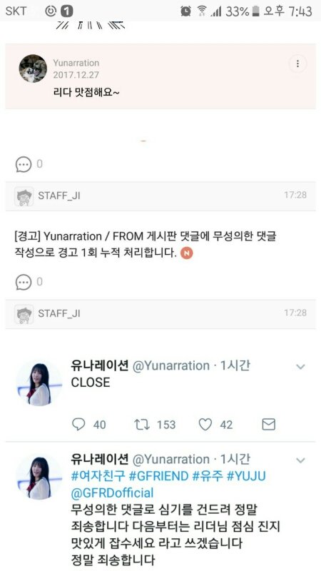 아랫댓쓴인데 설명이 좀 부족했네 멤버 지칭시 양 또는 님등의 경어체 호칭을 붙일 것이 공식 규정. 규정 위반