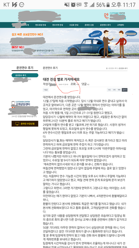 운전연수도 일종의 서비스업인데, 서비스의 기본인 친절도 없고 강사가 황당한 소리를 늘어놓으니 도저히 환불만으로는 넘어갈 수가 없어서 다른분들은 피해 입지 마시라고 후기에 글을 올립니다.