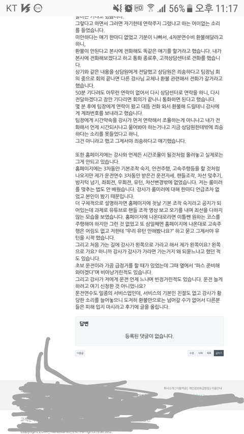 ㅎㅂ ㄷㄹㅇㅂ에서 운전연수를 받았는데 강사가 이상하게 굴어서 본사랑 전화하고 환불받기로 했는데 자세한 상황은 캡쳐된 사진에 모두 담겨있고...
