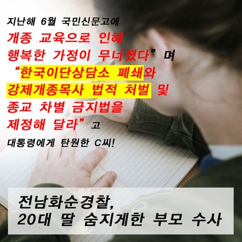 지난 1월 18일 인데요.전남 화순시에서 개종강요로 인해 가정파탄을 호소하였던 한 이십 대 여성이사망하여 논란이 되고 있습니다.이에 화순경찰서에선 이단상담소를 나가려는 딸을 제지하던 중 숨지게 했던부모를 조사중에 있는데요.