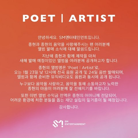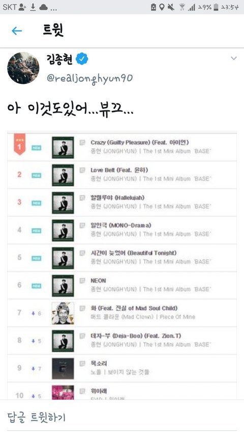 1위 꼭 했으면 좋겠다 종현이 만든곡 가사를 곱씹을수록 종현은 정말 공감능력이 뛰어난거같음 다른사람을 위로해주는법도 누구보다 잘알고 하루의끝이나 한숨 가사도 잘보면 자기도 예전에 위로를받을때 상처받은적이 있어서 그런지 듣는사람은 짧은문장인 가사로도 상처받지않게 정말 조심스럽게 쓴거같아보임 ..신곡기대된다 노래나오면 꼭 들을게 아 그리고 신곡나오면 확대해석하지 말고 그냥 가수들 신곡나올때 듣는것처럼 어느때와 다를거없이 듣자