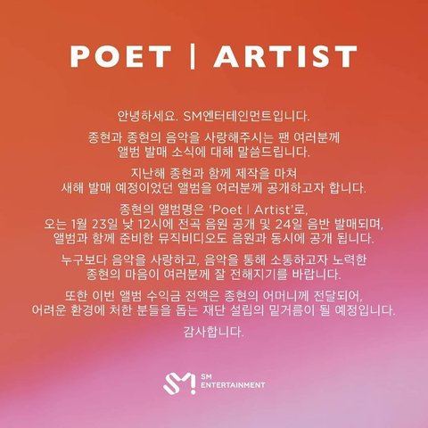 아 그런데 이번에 나오는 노래에 대한 지나친 해석은 하지 말아줘. 이 노래들을 어떤 마음으로 쓴것인지는 종현이만 아는거니까, 멋대로 해석하고 슬퍼하진 않았음 좋겠다