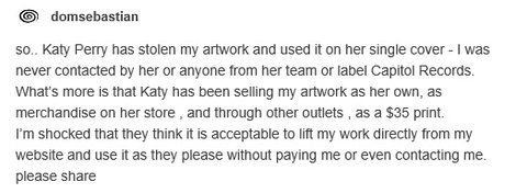 케이티페리가 저의 작품을 훔치고 싱글 커버로 사용했습니다. 저는 케이티 페리는 물론 그 레이블에 관련된 어떠한 사람들에게도 연락을 받은 적이 없습니다. 게다가 그녀의 공식 홈페이지에서는 머천다이즈도 판매중입니다. 저는 그들이 저에게 연락도 하지 않고 비용도 지불하지 않은채로 제 웹사이트에 있던 작품을 가져오는게 괜찮다고 생각하는 것에 대해 충격을 받았습니다. 제발 공유해주세요