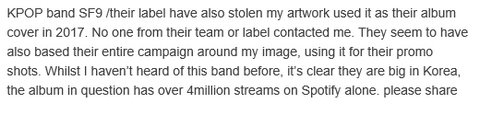 케이팝 그룹인 SF9 또한 제 작품을 훔쳐 앨범 커버로 사용했습니다. 누구도 저에게 연락을 하지 않은채로요. 홍보용 사진에서도 제 작품을 사용했습니다. 저는 이 그룹에 대해 들어본 적은 없지만 한국에서는 유명한 그룹임이 분명합니다. 문제의 이 앨범은 스포티파이에서만 4백만번 스트리밍 되었습니다. 제발 공유해주세요