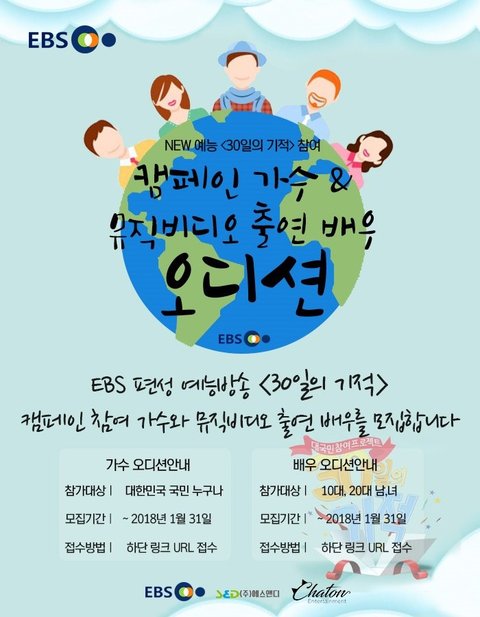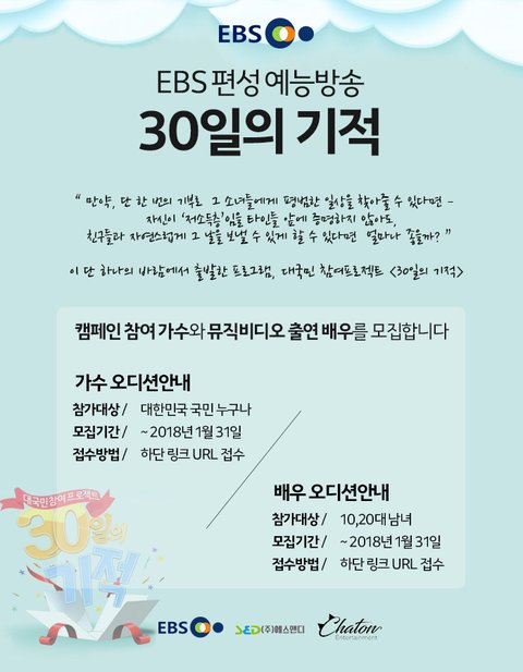 EBS 편성 예능 방송 <30일의 기적>뮤직비디오 출연 배우 / 캠페인송 참여 가수 지원자를 모집하고 있습니다!