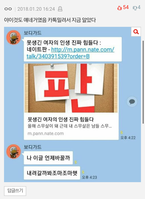 결국 한 판녀가 글쓴이한테 어그로 아닌거 인증