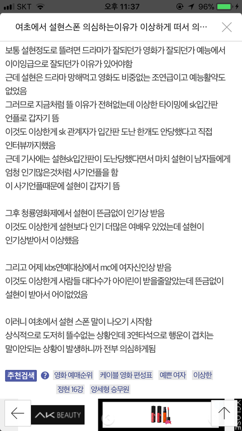 설현 무작정 까내리려고 하는게 아니고 의심이 드는거임 나도 설현 호감이고 지코랑 열애설 났을때도 누가 아깝다 누가 아깝다 이런말 없이 그냥 아무 생각없었음 지들끼리 좋아서 사귀는데 내가 뭐라고 할말이 있겠음?? 근데 설현 이쁘고 몸매좋은건 나도 인정하고 다 인정하잖슴? 근데 저 기자가 말하는것도 그렇고 찌라시도 그렇고 약간 설현이라고 의심도 들고 수지나 혜리 같은 경우엔 수지 같은 케이스는 데뷔초때부터 얼굴 이뻐서 난리가 났었잖아 그래서 cf퀸 100억소녀 이런 타이틀도 얻고 영화 건축학개론 찍어서 대박났잖아 그리고 저번에 박진영이 했던 파티피플에사 요번에 재계약해서 박진영이 고맙다고 했잖아 그리고 수지가 만약에 저 기자가 말햇듯이 인성이 저러면 박진영이 가만히 있았을까? 그리고 혜리는 군대에서 애교로 떳잖아 근데 설현은 대박 터트린 작품도 딱히 없었는데 갑자기 cf를 그렇게 많이 찍는갓 자체가 나는 의심이 가는거임