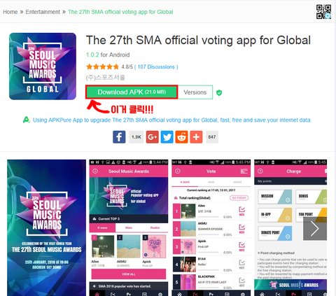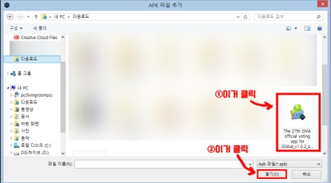1. 컴에서 석.아대 글로발 앱 apk파일을 다운받아.(다운로드 링크>https://apkpure.com/the-27th-sma-official-voting-app-for-global/com.sportsseoul.smaglobal#menu