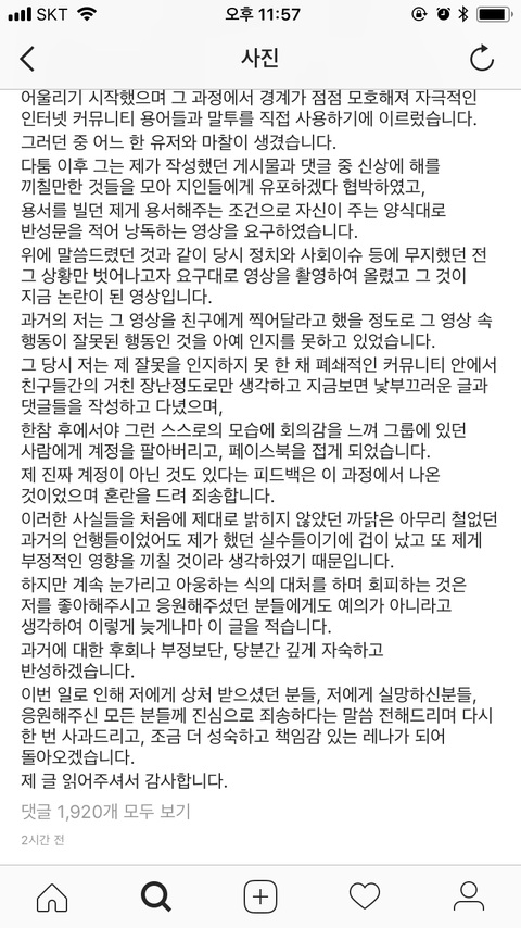 강제로 협박받아서 앙망문을 읽었다고 나와있는데 한때 레나 페북이름이 장앙망이었음~ 그것도 구라인거임~ 그거외에 강간피해여성 희롱, 세월호로 드립친건 일체 피드백없음~ 게다가 ___, 보툭튀, ___같은 단어 일상적으로 쓰는애가 여자들을 위한 컨텐츠를 계속 만드려고 한다는게 말이됨?ㅋㅋㅋ