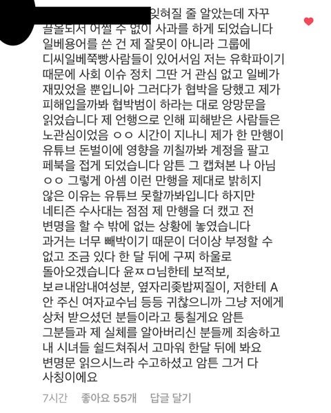 +) 왜 톡선 내려갔는지 의문이네 ㅋㅋㅋㅋ 피드백 (이라며 올린 변명나부랭이) 에서 보면 알수있지만 대필냄새도 팍팍나고 실시간으로 댓글 지워대는거 보면 소속사도 제정신이 아닌거같다 ㅋㅋㅋ