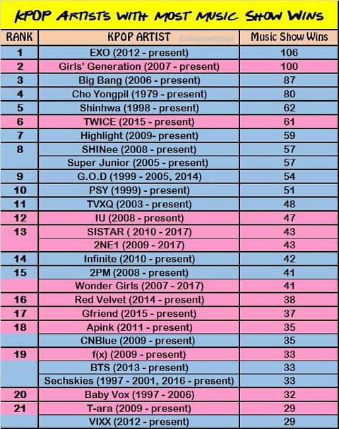음악방송 1위횟수 순위표