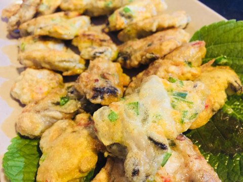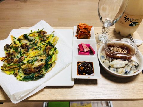 시골 집에서 가져온 꼬막으로 만든 꼬막부추전.