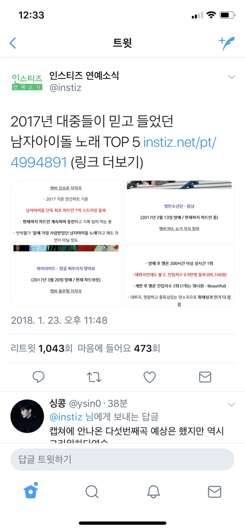 우리 2018년 12월 31일까지는 무조건 차트인 목표로 하고 달리자. 3주찬데 평소같으면 활동기잖아 독하게 맘 먹고 해야할 것 같다 수록곡 안 돌리는 거 보고 진심 좀..많이 충격 받고 와서 그런지 진짜 우리 팬덤 정신 차려야할 것 같아 다들 화이팅화이팅! 내년 이맘때쯤 올라올 저런 글에 우리가 당당히 올라올 수 있도록 하자.
