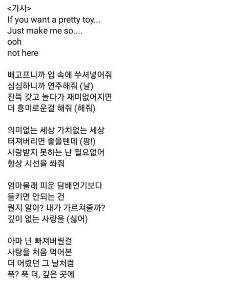 이번 고등래퍼 2 지원하는 민티라는 앤데 ㅋㅋ 속삭이는 위스퍼랩이라나... 무튼 옷에 eat me부터 해서 가사까지 어딜 봐도 로리컨셉... 사람들이 댓글에 빨아주던데 진짜 역겹다...ㅋㅋ 어째 고등래퍼는 제대로 된애가 안나오냐?? 이런애가 뜨면 안된다 진짜 역겨워 로리는 엄연히 불법인데 너무 싫어;