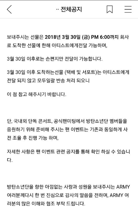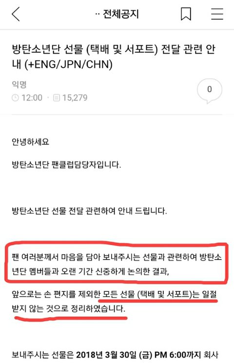 하나 더 추가하자면 홉이랑 슈가 생일까지만 받겠다는건데 그 이유는 홉이랑 슈가 생일서폿은 이미 준비가 끝난 분들이 많아서 그런거 같음. 그거 안 받으면 ㄹㅇ 그 분들은 돈 날리는거니까