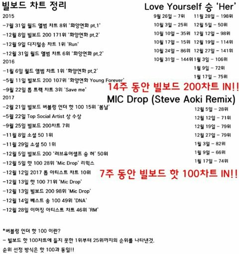 빌1보1드 차트인 몇주 했는지랑 빌1보1드 순위 든거 정리~!!