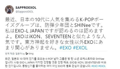 다른 엑소엘 트윗은 하나도 안 쓰고 항상 얘 트윗만 가져와서 우리 일본 인기 후려침