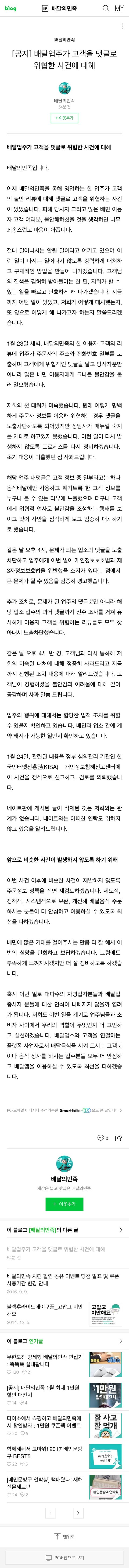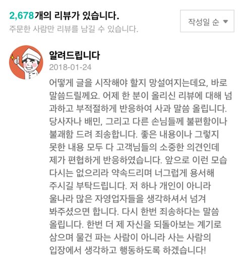어제 배달의민족을 통해 영업하는 한 업주가 고객의 불만 리뷰에 대해 댓글로 고객을 위협하는 사건이 있었습니다. 피해 당사자 그리고 많은 배민 이용자 고객 여러분, 불안해하셨을 것을 생각하면 너무 죄송스럽고 마음이 아픕니다.
