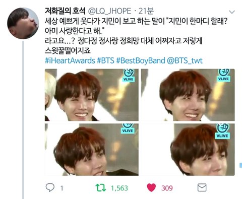 발린다 진짜로... 너무착해...원래 지민이가 가장 바깥쪽에 서있었는데 저 말 하구 자기가 바깥쪽으로감.... 아씨 호석이 ㅠㅠㅠ