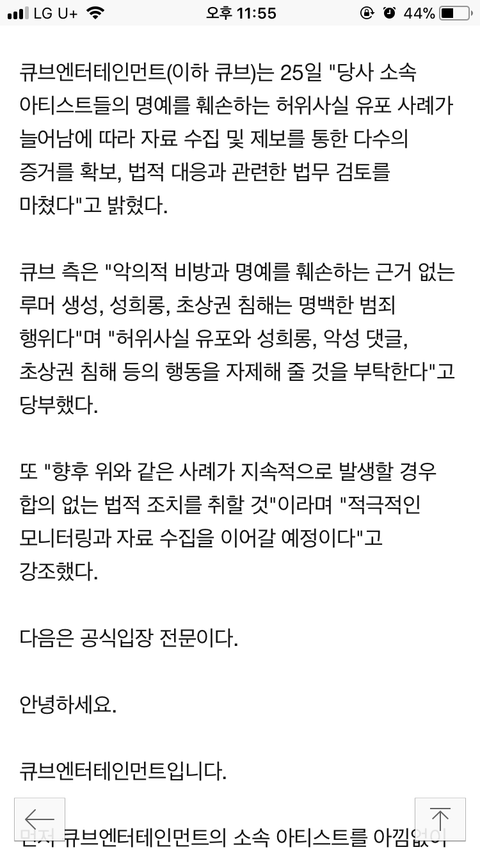 큐브 측 “아티스트 명예훼손 증거 확보, 법적 대응”